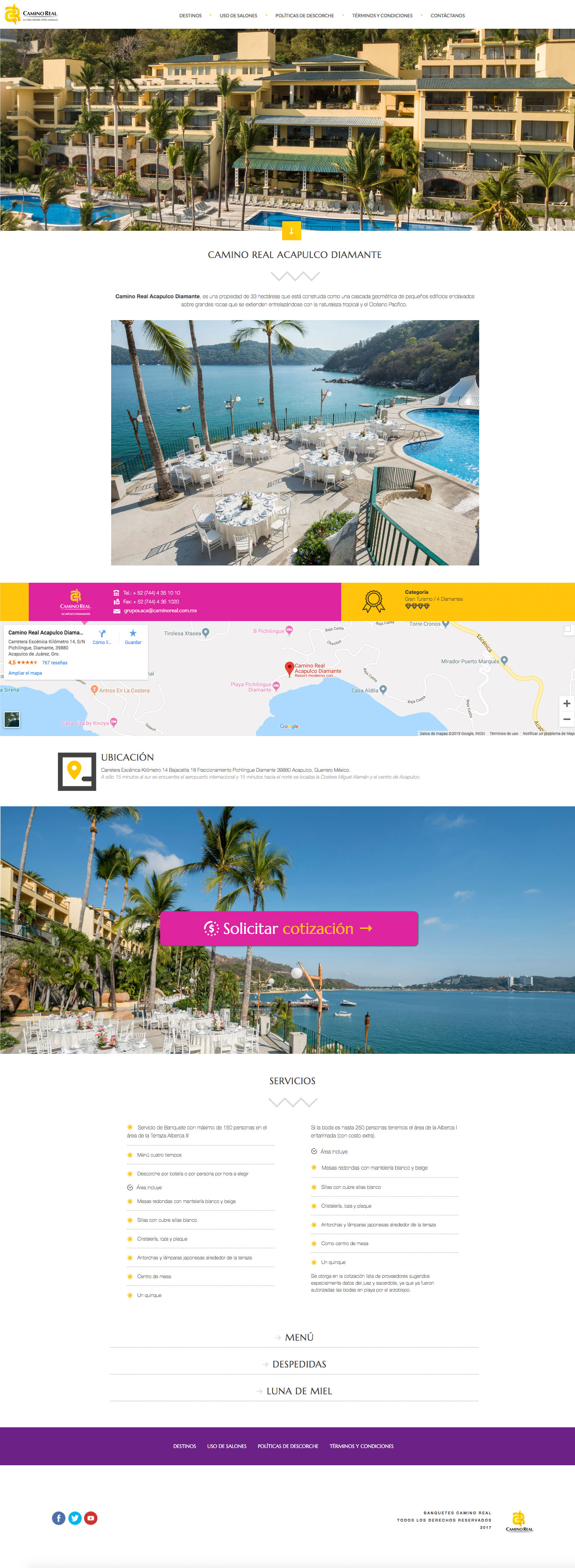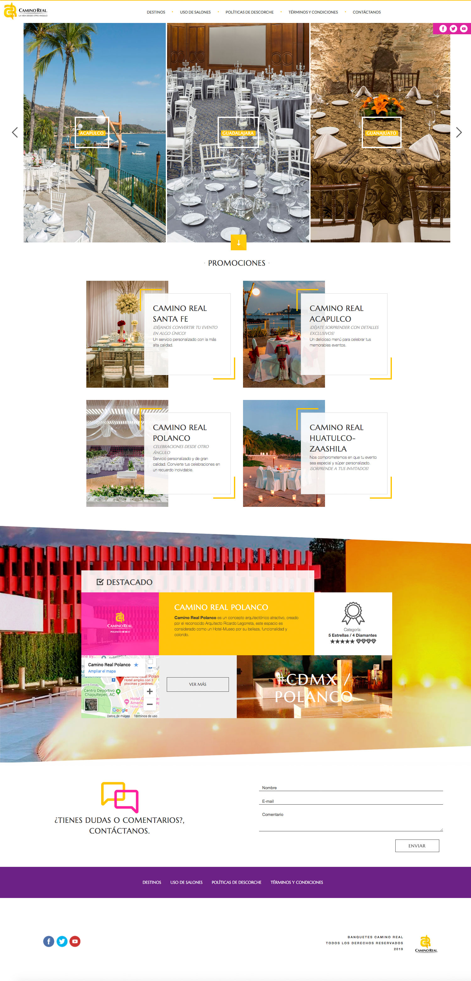 Banquetes Camino Real Project carried out in 2016 and was based on a complete redesign of the page and responsive web development, in subsequent years it received maintenance and updating of content, mainly the annual catalog with new products.
