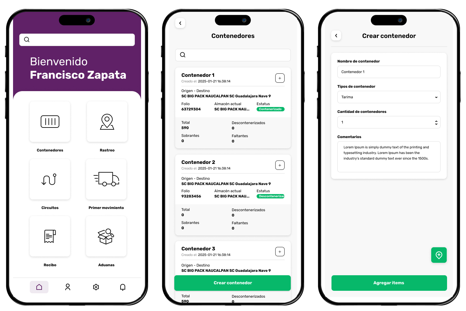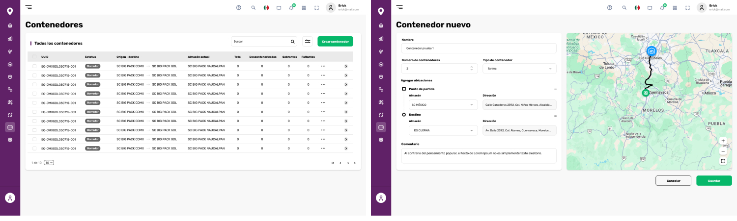 • Registro de ubicación (puerto, patio, cliente), estado (vacío, lleno, en tránsito, en devolución).