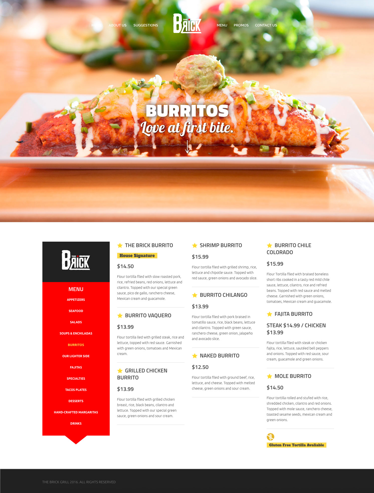 The Brick Mexican Grill Proyecto realizado en el año 2016 y se basó el en rediseño completo de la página y desarrollo web responsivo, en los años posteriores recibió mantenimiento y actualización de contenidos, principalmente el catálogo anual con los productos nuevos.