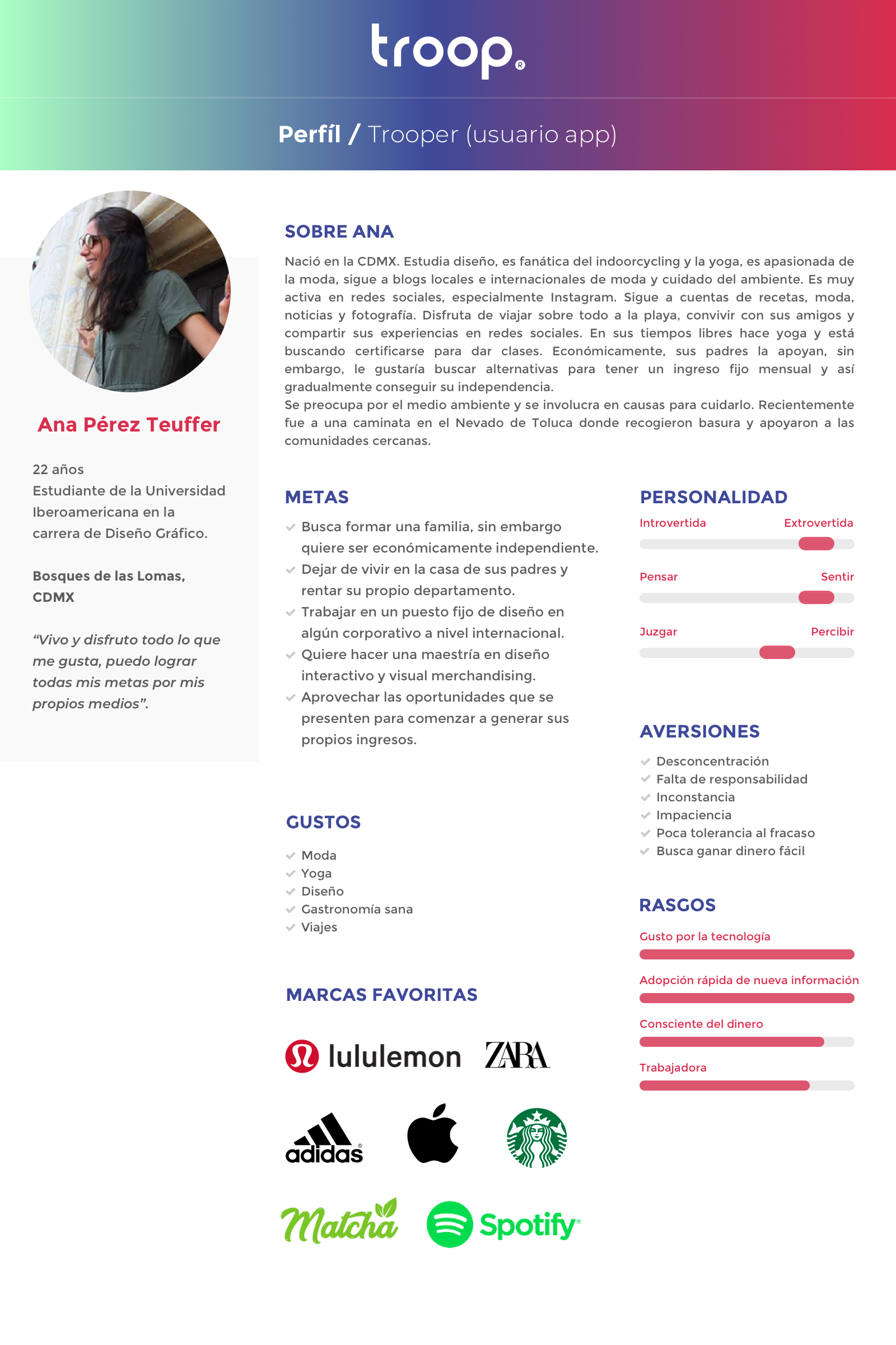 Investgación para definir al usuario, sus necesidades y objetivos. Planeación en conjunto con diferentes equipos para el desarrollo del flujo de la aplicación. Encargado del diseño de wireframes y de la interfaz final. Supervisión de los resultados finales con el equipo de desarrollo. Preparación y aplicación de pruebas de usuario, análisis de resultados y preparación de informe con insights finales.